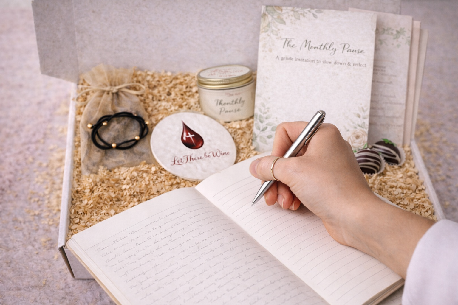 Let There Be Wine offers thoughtfully curated experience boxes designed for reflection, connection, and meaningful moments at home. Our boxes are rooted in faith but intentionally created to be welcoming and accessible to all.